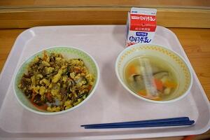 高千穂牛っと丼、はちはい汁、牛乳(ぬくもりランチ)