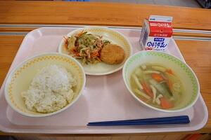 麦ごはん、さつま汁、彩り野菜とキャベツのメンチカツ、きゅうりのおかか和え、牛乳