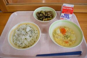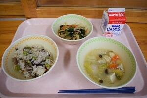 山菜おこわ、かきたま汁、厚揚げの甘辛炒め、牛乳