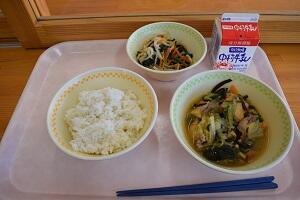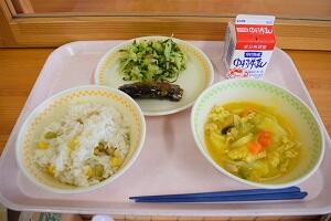 三色豆ごはん、ほうとう、いわし梅煮、昆布和え、牛乳