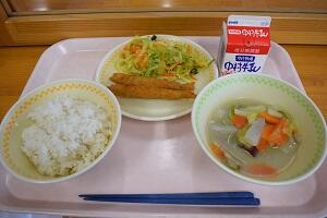 麦ごはん、さつま汁、ししゃもフライ、添え野菜、牛乳