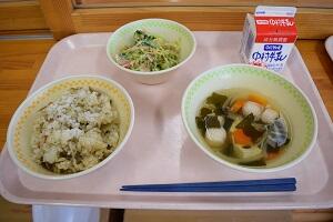 地頭鶏めし、すまし汁、磯マヨネーズ和え、牛乳