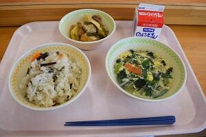 山菜おこわ、かきたま汁、厚揚げの甘辛炒め、牛乳