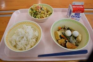 麦ごはん、肉じゃが、春キャベツの和風サラダ、牛乳
