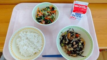 麦ごはん、五目スープ、ゴーヤチャンプルー、牛乳、ももゼリー、牛乳