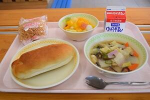 ミルクパン、牛乳、長崎皿うどん、フルーツ白玉