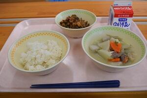 麦ごはん、牛乳、大豆とひじきのにしきあげ、豚汁