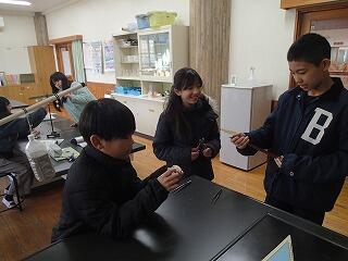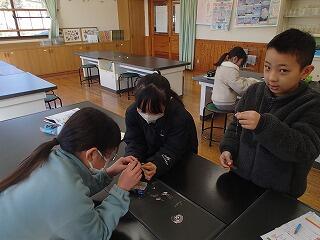3年生は理科の学習で磁石のきまりを調べています。今回の授業では、磁石につけた鉄くぎが磁石になるのかをゼムクリップや方位磁針を使って実験で調べました。実験や考察を通して、じしゃくについた鉄くぎにもN極・S極があること、地球自体も磁石のように極があることを発見できました。