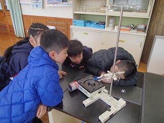 4年生は理科の学習で水のあたたまり方を実験で調べました。前時で実験した金属のあたたまり方とは違って、火から離れた上の方の水から色が変化してあたたまっていくという結果にとても驚いた様子でした。安全に気をつけて、みんなで協力しながら実験を行うことができていました。