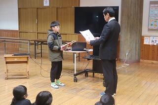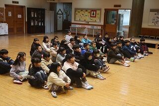 2月3日(火)に全校朝会を行いました。一番はじめに集合した1・2年生は全員がそろうまで、よい姿勢で無言のまま待つ態度が立派でした。寒いホールの中でしたが、子どもたちはいつものようにうなずいたりメモを取ったりしながら、校長の話や月目標の話を一生懸命に聞いていました。最後に、バレーボールで優勝に貢献した児童をみんなで称賛しました。