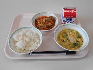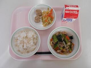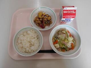 麦ごはん、牛乳、豚肉のケチャップ炒め、中華コーンスープ