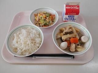 麦ごはん、牛乳、おでん、大豆とツナのサラダ