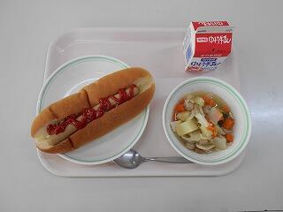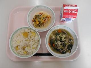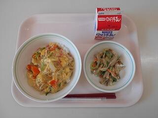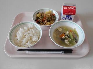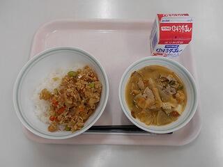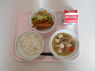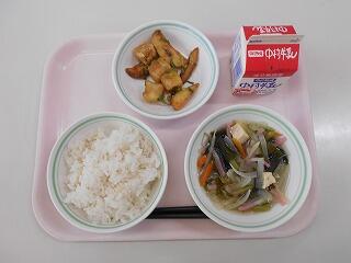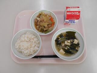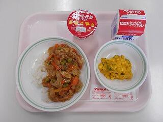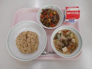 麦ごはん、牛乳、豚肉のケチャップ炒め、中華コーンスープ