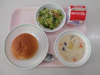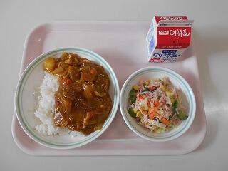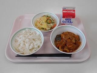 麦ごはん、牛乳、かぼちゃのミートソース煮、パインサラダ