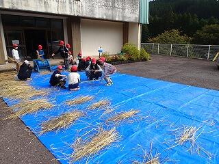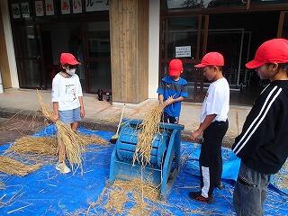5・6年生は10月上旬に稲刈りをしましたが、次の工程として10月21日(火)に脱穀をしました。学校にある足踏み脱穀機を使って1人ずつ作業をしました。秋晴れの中で順調に脱穀作業を終えることができました。