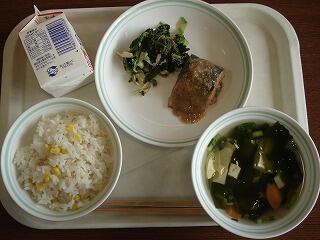 今日の給食は『コーンご飯、たけのこのすまし汁、おかか
