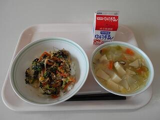 麦ごはん、牛乳、五目きんぴら、野菜のそぼろ汁