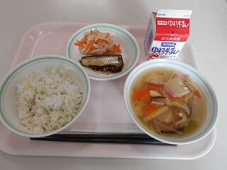 えんどうごはん、牛乳、豆腐の五目煮、けんちん汁