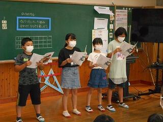 朝の時間に、1学期の終業式を行いました。代表児童が、1学期がんばったことを発表してくれました。算数の勉強と水泳でバタ足25m泳げるようにがんばったということでした。いよいよ明日から夏休みです。健康に注意し、楽しい夏休みを過ごしてほしいと願っています。