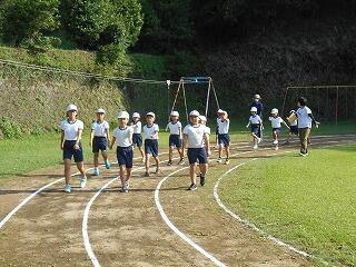 朝の活動から1時間目まで、運動会の練習を行いました。入場行進と開会式の練習です。初めての行進でしたが、とても上手にできていました。特に1年生は、疲れを見せることもなくしっかりと手を振り、足を上げて入場行進をすることができました。暑い中でしたが、よく頑張っていた子どもたちでした。