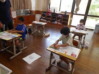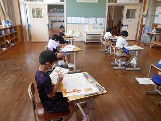 3年生が、あじさいの花の絵を描いていました。少し雨が降っていましたが、実際のあじさいを切ってきて実物を見ながらの花の絵です。どの子も楽しそうに絵を描いていました。雨の中ですが、あじさいはとてもきれいでした。