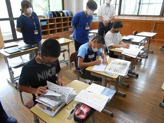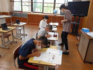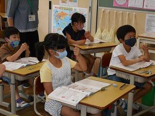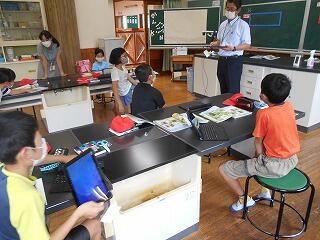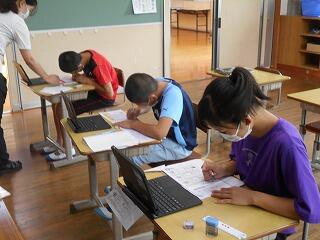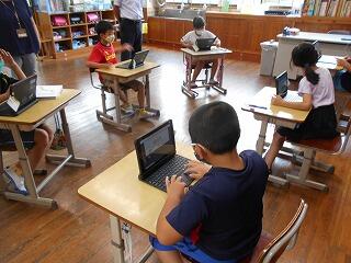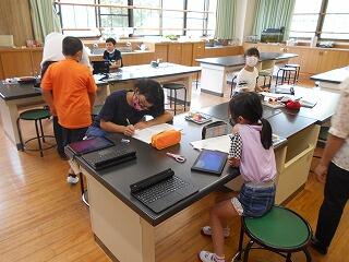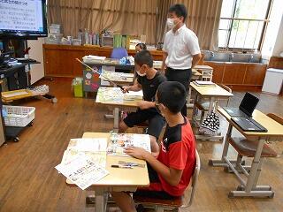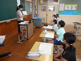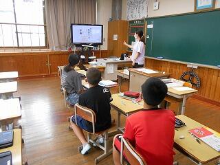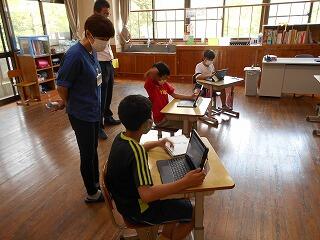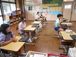 1年生は、タブレットを使って「早口ことば」を調べていました。図書室の本で探すよりも簡単でたくさんのことを調べられそうでした。2年生は、かけ算九九の暗唱をがんばっていました。覚えるのが大変なようでした。4年生は、タブレットの使い方の確認をしていました。担任の先生が楽しそうでした。5年生は、理科で流れる水の働きの学習でした。6年生は、英語の学習で「20年後の同窓会」を想像して、住んでいる場所や仕事についてお互いに質問をしていました。英語での会話が、上手でした。