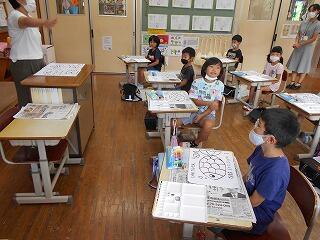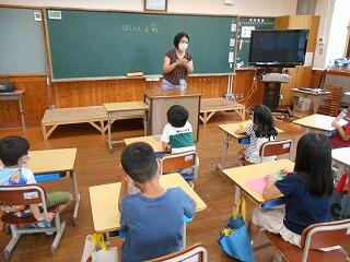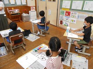 1年生が、夏休み中に各家庭で観察とお世話をしていた「あさがお」からとれた種を確認しながら、生活科の学習をしていました。たくさんとれていたようで、「こんなにとれたよ。」と見せてくれました。2年生は、生活科で1年生を招待して遊ぶための道具を考えていました。4~6年生は、リレーのバトンの練習でした。どの子もがんばっていました。