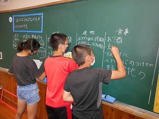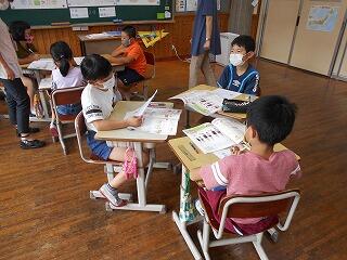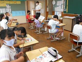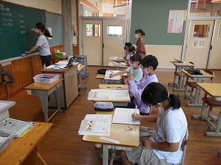 2時間目は、1年生は、国語の勉強をしていました。友達の好きなことをインタビューして、作文用紙に書いていました。1年生にしてはなかなかの量の文章を、一生懸命に作文用紙に書き綴っていました。2年生は、かけ算の練習でした。下がり九九を熱心に唱えている子もいました。4年生は、ハマグリ碁石について調べていました。6年生は、日本の伝統を発信するための調べ学習をしていました。どの学年も熱心に学習していました。