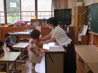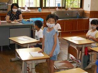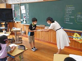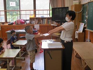 1学期最終日となりました。終業式を行いましたが、子どもたちは、4時間目にそれぞれの担任の先生から「あゆみ」通知表を受け取って、うれしそうにしていました。1年生は、初めてだったので、担任の先生から「あゆみ」の見方について説明を受けていました。どの子もがんばっていたので、家庭でもたくさんほめてあげてください。