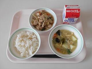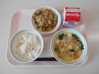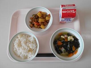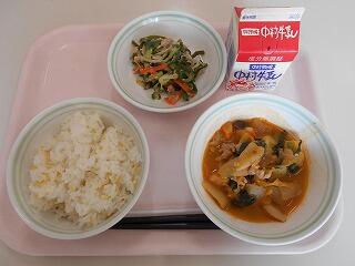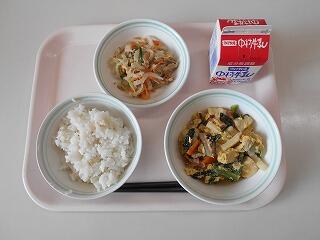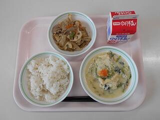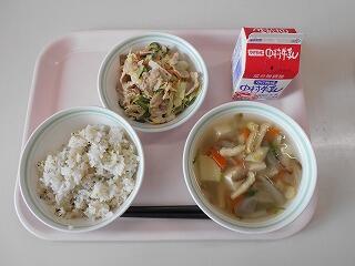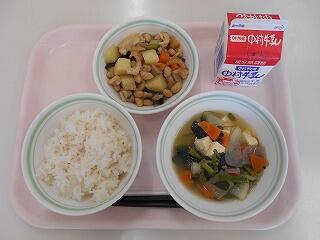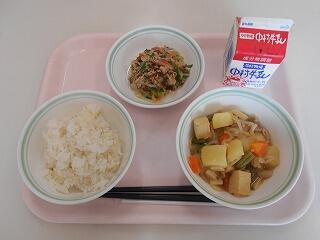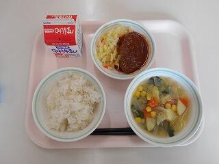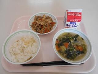 麦ごはん、牛乳、五目きんぴら、野菜のそぼろ汁