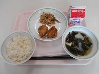 麦ごはん、牛乳、鶏の唐揚げ、もやしのおかか和え、すまし汁