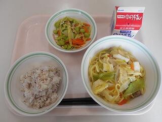 減量ゆかりごはん、牛乳、ちゃんぽん、青豆サラダ