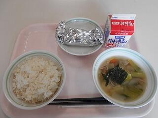 麦ごはん、牛乳、魚のみそバターホイル蒸し、鶏ごぼう汁