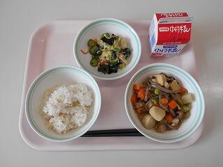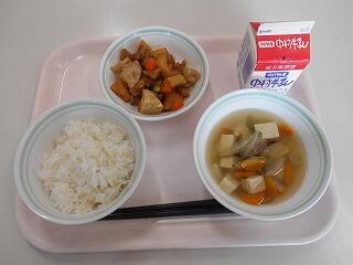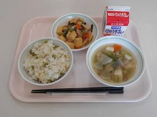 えんどうごはん、牛乳、豆腐の五目煮、けんちん汁