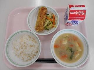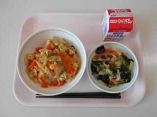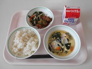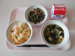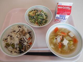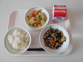 ひじきごはん、牛乳、豆腐団子汁、マヨネーズ和え