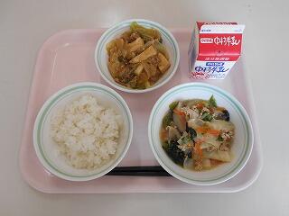 麦ごはん、牛乳、鶏肉とれんこんの揚げ煮、はちはい汁