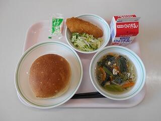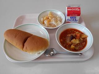 コッペパン、牛乳、チリコンカン、フルーツヨーグルト