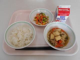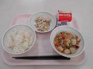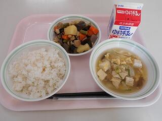 麦ごはん、牛乳、里芋のそぼろ煮、大豆とツナのサラダ