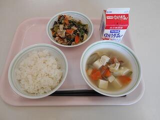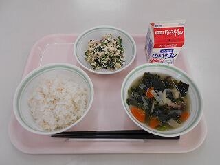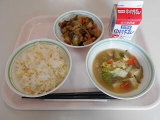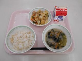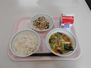 麦ごはん、牛乳、磯マヨネーズ和え、五目スープ