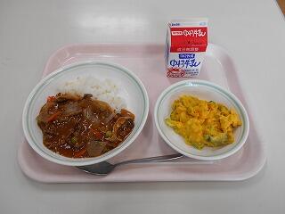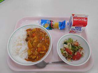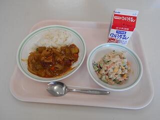 秋味カレーライス、牛乳、大豆とツナのサラダ