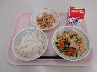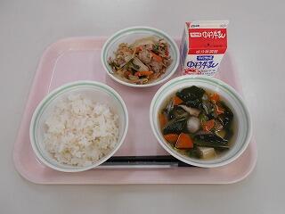 麦ごはん、牛乳、小松菜と豚肉のうま味噌炒め、吉野汁