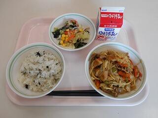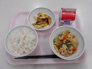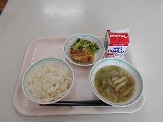 麦ごはん、牛乳、厚揚げの磯煮、りっちゃんのサラダ