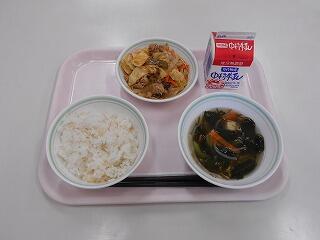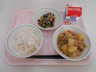 麦ごはん、牛乳、肉じゃが、わかめの酢の物