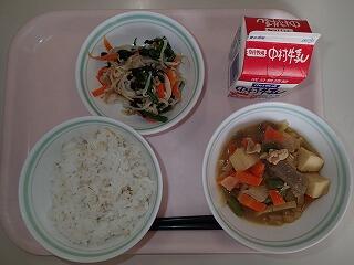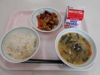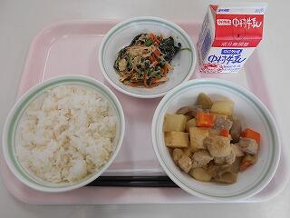 麦ご飯、牛乳、鶏肉と里芋の味噌煮、ごま和え
