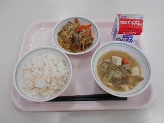 麦ごはん、牛乳、千切り大根の炒め煮、豚汁