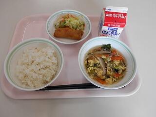 麦ごはん、牛乳、春巻き、ごま酢和え、春雨スープ