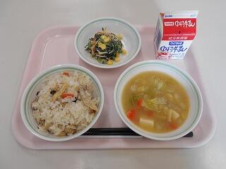 キムタクごはん、牛乳、里芋のみそ汁、和風サラダ