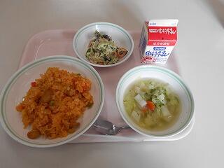 メキシカンライス、牛乳、白菜スープ、ごまネーズサラダ