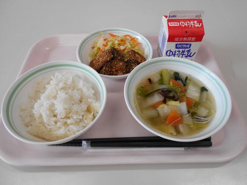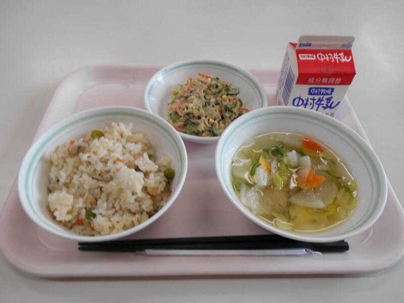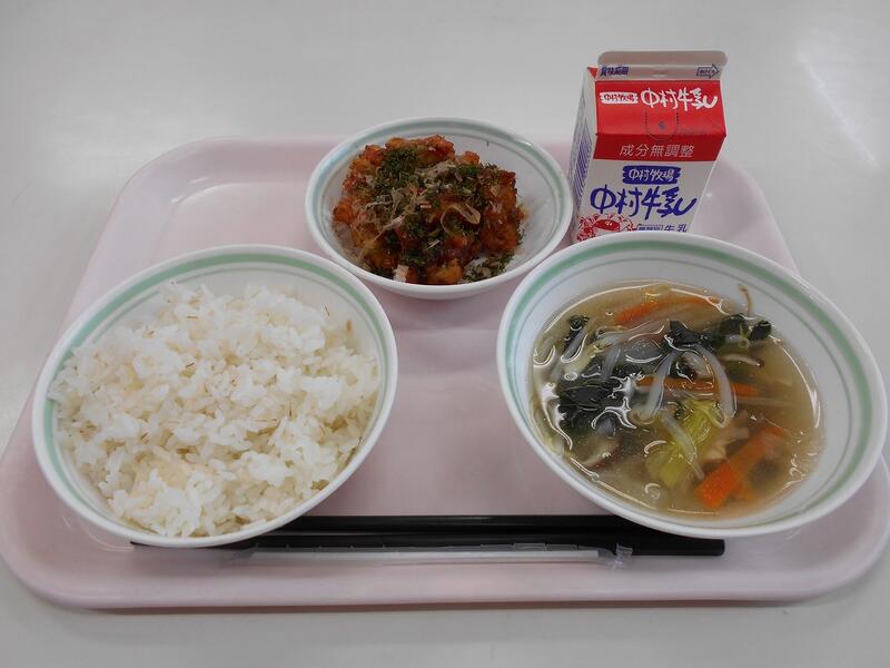麦ごはん、ちくわの磯辺天ぷら、おかか和え、野菜のそぼろ汁、牛乳