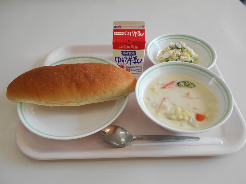 コッペパン、ツナサラダ、冬野菜のクリーム煮、牛乳